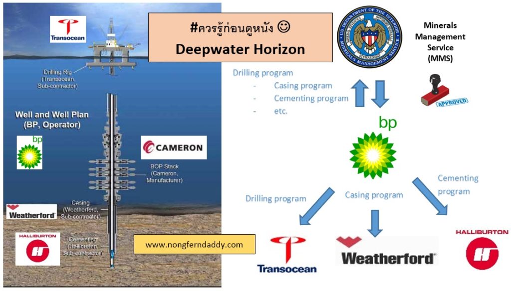 ผมก็ไม่ทราบว่าจริงๆแล้วในหนังจะกล่าวถึงใครบ้าง พระเอก ตัวเอก ใครตำแหน่งงานอะไร (ก็ยังไม่ได้ดูเหมือนเราๆท่านๆนี่แหละครับ) แต่ก็รู้ไว้ประดับรอยหยักในสมองก็แล้วกันว่า ในวันที่ลงแข่ง(เกิดเหตุ)ตัวเล่นหลักๆในสนามจริงก็มี 6 คนนี่แหละครับ MMS BP Transocean Weatherford Halliburton และ Cameron
