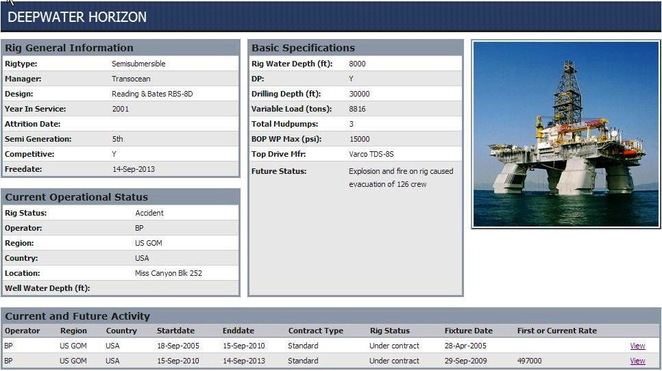 แท่นขุด (drilling rig) ลำนี้เป็นแท่นยักษ์ ใช้ขุดในทะเลน้ำลึกได้ถึง 30,000 ฟุต หรือ ราวๆ 9 กิโลเมตร ค่าเช่าราวๆวันล่ะ 500,000 เหรียญ หรือ ราวๆ วันล่ะ 17 ล้านบาท (นาทีล่ะ 12,000 บาท) ถ้าเป็นมวยก็รุ่นยักษ์ระดับไมค์ไทสันจอมงับหูนั่นแหละครับ ถ้าเป็นเครื่องบินก็ไม่ใช่แค่ระดับ 747-400 ผมว่าเทียบชั้นได้กับกระสวยอวกาศเลยทีเดียว