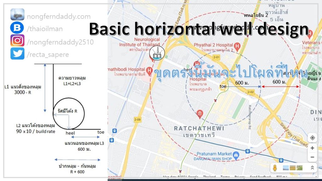 จบการตีโค้ง (build) ได้ 900 ม. หลุมผมก็จะนอน (เอียง 90 องศาจากแนวดิ่ง) พอดี๊พอดี ตอนนั้นหัวเจาะผมก็จะนอนขนานไปกับพื้นโลก (heel) เหนือหัวเจาะผมขึ้นไป (3000 ม.) ถึงผิวโลกก็จะเป็น รพ. พระมงกุฏฯ