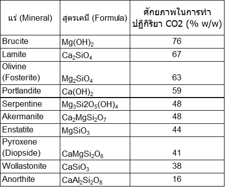 ตารางสรุปชนิดแร่ สูตรโมเลกุล และ ศักยภาพในการทำปฏิกิริยากับ CO2 ทางทฤษฎี