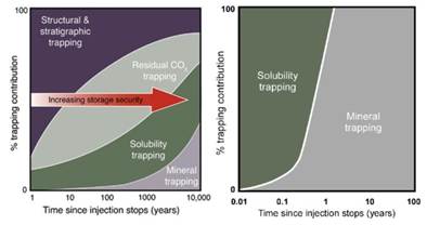 - CO2 แปลงร่างไปรวมอยู่กับน้ำกลายเป็นโซดา เนื่องจากกลไกการละลาย (Dissolution Trapping)