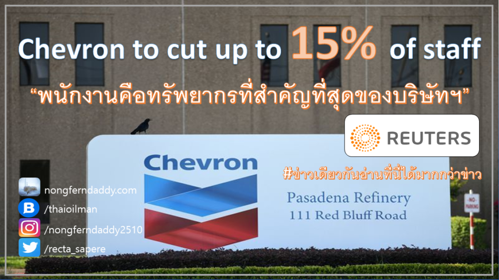 Chevron to cut up to 15% of staff ปลดพนักงาน 15% – เรื่องปกติครับ ในยามนี้ที่ค่าใช้จ่ายพนักงานเป็นเรื่องต้นๆที่ทุกบ.เลือกที่จะลด เพราะทำได้ง่าย เห็นผลทันที จากขาดทุนเป็นเท่าทุน หรือเป็นกำไร
