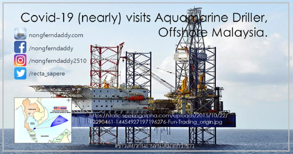 FacebookFacebookXTwitterLINELineCovid-19 (nearly) visits Aquamarine Driller, Offshore Malaysia. – ไม่ใช่เรื่องน่าแปลกใจอะไรครับ ทุกคนทราบดีว่ายังไงเราก็หยุดมันไม่ได้ก็แค่ชลอๆให้ระบบสาธารณสุขของเรารับไหว ในระหว่างนั้นก็รอยารอวัคซีน และ … Continue reading Covid-19 (nearly) visits Aquamarine Driller, Offshore Malaysia.