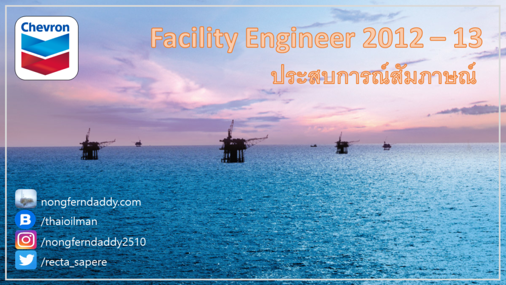 Facility Engineer 2012 2013 Chevron ประสบการณ์สัมภาษณ์ – เป็นอีกงานหนึ่งของบ.น้ำมันที่มีตำแหน่งทั้งที่ทำนอกชายฝั่ง และ ในออฟฟิต