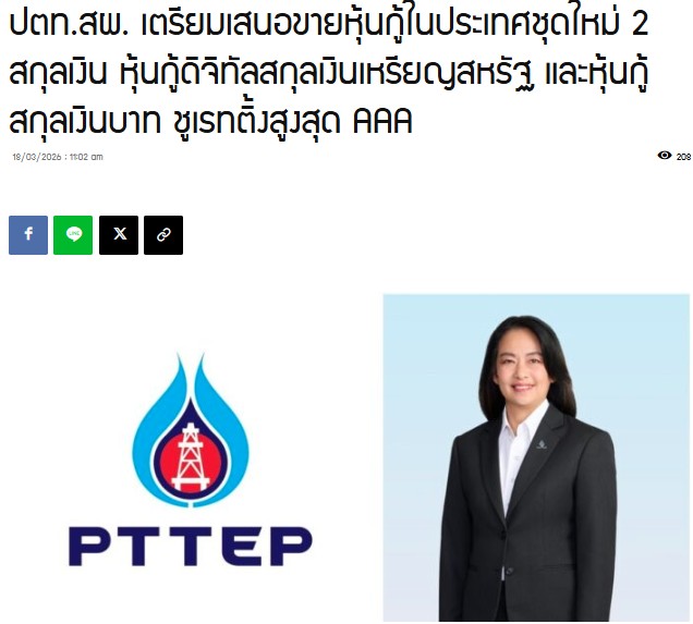 Quote from nongferndaddy on March 19, 2026, 09:17ปตท.สผ. เตรียมเสนอขาย 2 หุ้นกู้ชุดใหม่ “หุ้นกู้ดิจิทัลสกุลเงินเหรียญสหรัฐ” สำหรับนักลงทุนรายย่อยครั้งแรกในเอเชียผ่านแอปพลิเคชัน “เป๋าตัง” และ “หุ้นกู้สกุลเงินบาท” สำหรับนักลงทุนสถาบันและผู้ลงทุนรายใหญ่ เปิดทางเลือกให้กับผู้ลงทุนที่สนใจลงทุนในองค์กรที่มีศักยภาพเติบโตอย่างยั่งยืน สะท้อนความเชื่อมั่นด้วยอันดับความน่าเชื่อถือจากทริสเรทติ้ง ที่ระดับสูงสุด “AAA” คาดว่าจะเสนอขายภายในไตรมาสที่ 2 ปี 2569