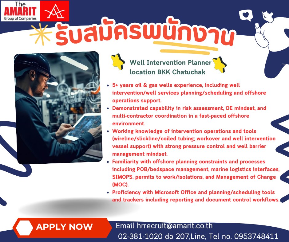 ประกาศรับสมัครงานด่วน! โอกาสดีๆ สำหรับคนที่กำลังมองหางาน พร้อมสวัสดิการแบบจัดเต็ม! เปิดรับสมัคร ตำแหน่ง Well Intervention Planner ร่วมเป็นส่วนหนึ่งของทีมงานมืออาชีพ เติบโตในสายงานได้จริง รายได้ดี พร้อมความมั่นคง