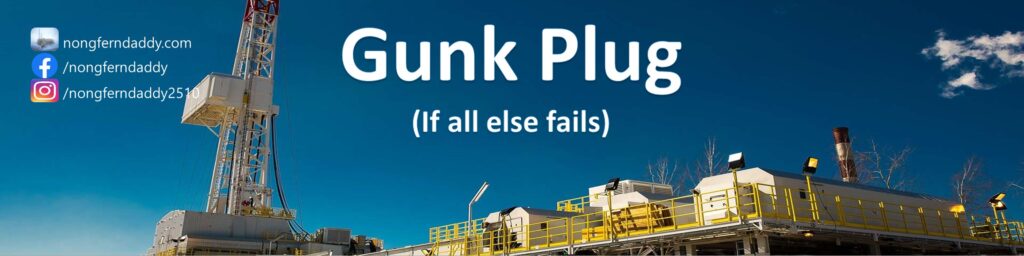 เจ้า gunk plug นี่ ก็คือ น้ำมันดีเซลผสมผงโคลนนี่แหละ (diesel + bentonite) ผสมเสร็จ ปั๊มลงก้านเจาะไปไว้หน้าช่วงชั้นหินที่รั่ว พอไปโดนน้ำในชั้นหิน มันก็จะเหนียวหนึบเป็นขี้โคลนหน้าตาหน้าเกลียดๆ