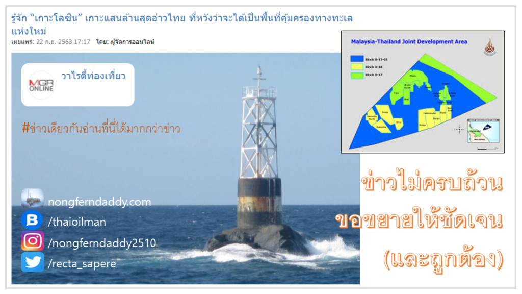 ประเด็นที่นักข่าวควรนำเสนอ หรือ ไปหาคำตอบมา คือ เมื่อถึงปี 2572 (ก็อีก 9 ปี ไม่ไกลเลย) เมื่อพื้นที่พัฒนาร่วมหมดอายุ ทั่นๆผู้ใหญ่ในบ้านเรา มีแผนอย่างไร เพราะโลซินไม่ใช่เกาะแล้วตามกติกาสากล เราก็จะเสียพื้นที่พัฒนาร่วมไป