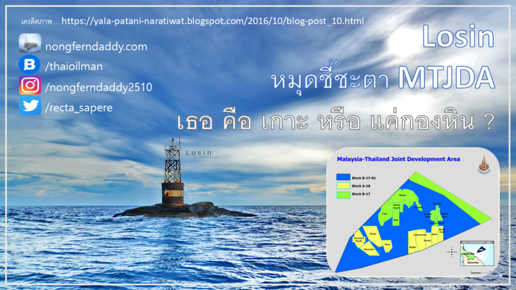 Losin หมุดชี้ชะตา MTJDA เธอ คือ เกาะ หรือ แค่กองหิน ? – MTJDA คือ พื้นที่ทับซ้อนที่ไทย และ มาเลเซีย ยุติข้อขัดแย้งทางพรมแดนชั่วคราว เพื่อพัฒนาพื้นที่ส่วนนี้ร่วมกันในการนำทรัพยากรก๊าซธรรมชาติขึ้นมาใช้ โดยการตั้งบ.ร่วมลงทุนขึ้นมา