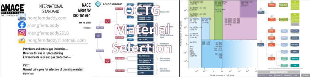 จะเห็นว่า material selection ไม่ว่าจะเป็นตาราง กราฟ ชาร์จ ของ ISO, บ.น้ำมัน หรือ โรงงานผลิตท่อ ก็ใช้ ค่า อุณหภูมิ partial pressure ของ CO2 H2S และ ปริมาณซัลเฟอร์