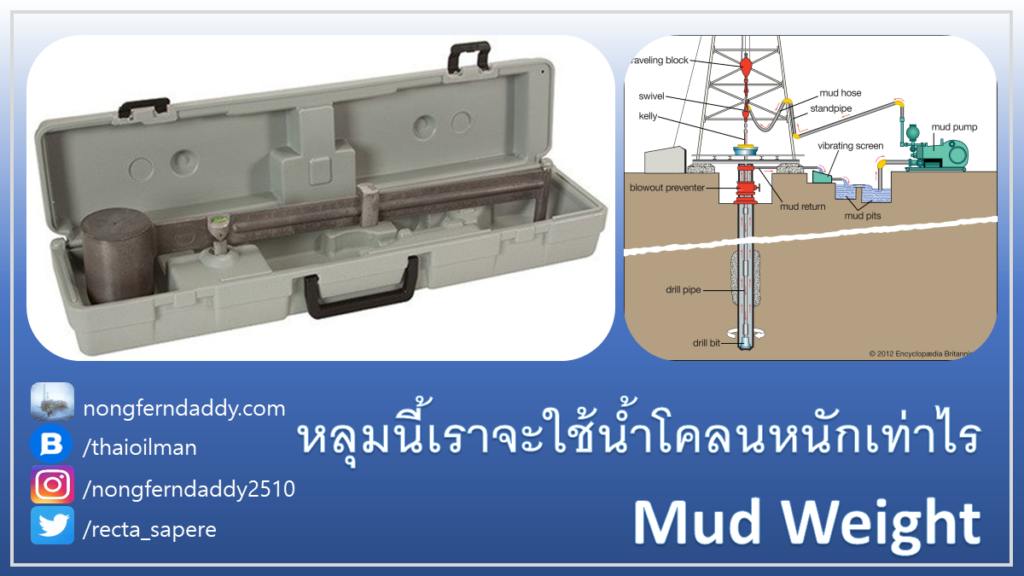 Mud Weight หลุมนี้เราจะใช้เท่าไรดี หลักการคิด (บางส่วน) – น้ำหนักน้ำโคลนที่จะใช้ในการขุดแต่ล่ะช่วงเป็นค่าแรกๆที่วิศวกรขุดเจาะต้องดีดลูกคิดออกมาว่าจะใช้เท่าไร เพราะมันมีผลกระทบมหาศาลเป็นลูกโซ่ต่อ อุปกรณ์ เครื่องไม้ เครื่องมือ ต่างๆอีกล้านแปด เช่น สารเคมีที่จะใช้ในการปรุงน้ำโคลนล่ะแน่ๆ