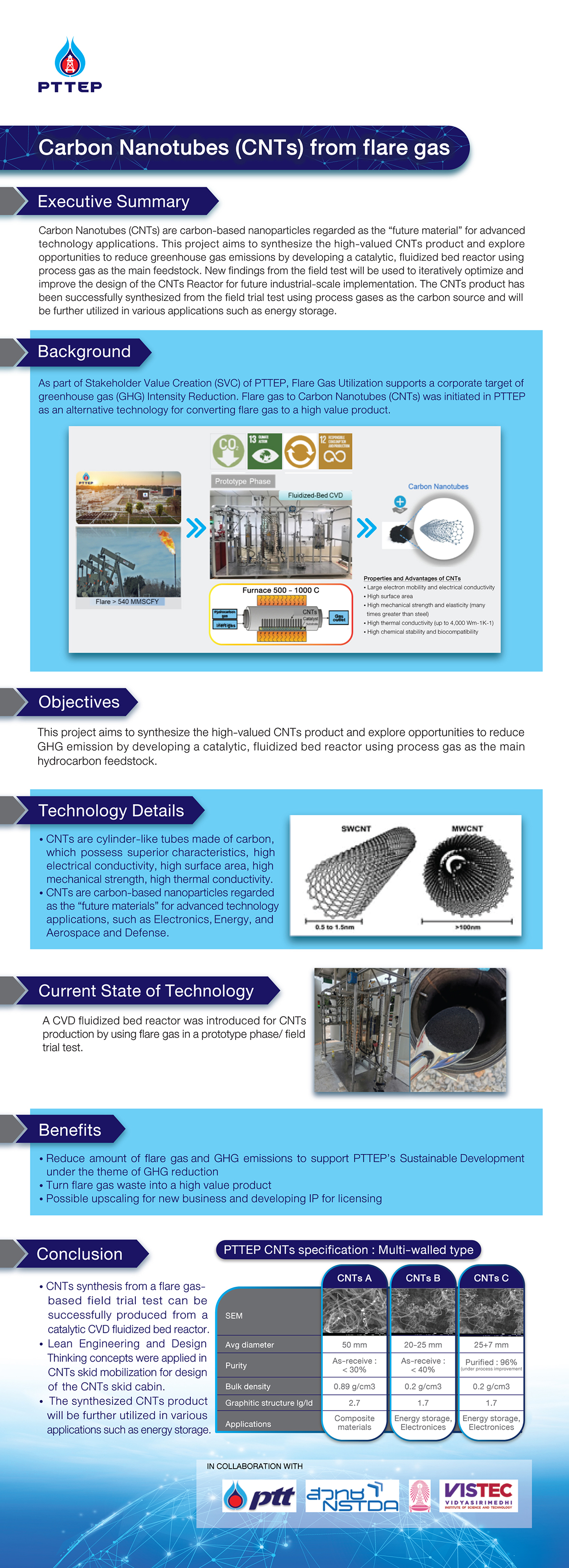 พวกเรารู้จัก flare กันดี เจ้าก๊าซที่จะเอาไปเผาทิ้ง (เป็น flare) เนี้ย พี่ใหญ่ก็จับมามาทำเป็น ท่อนาโนคาร์บอน (Carbon NanoTubes – CNTs) เสียเลย